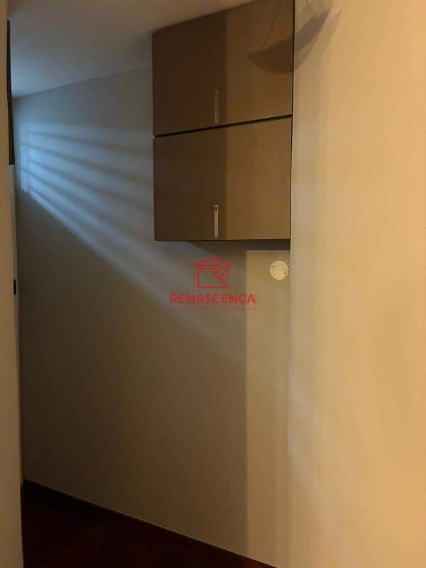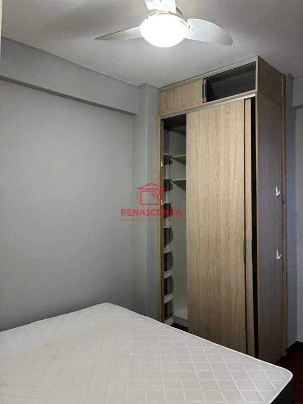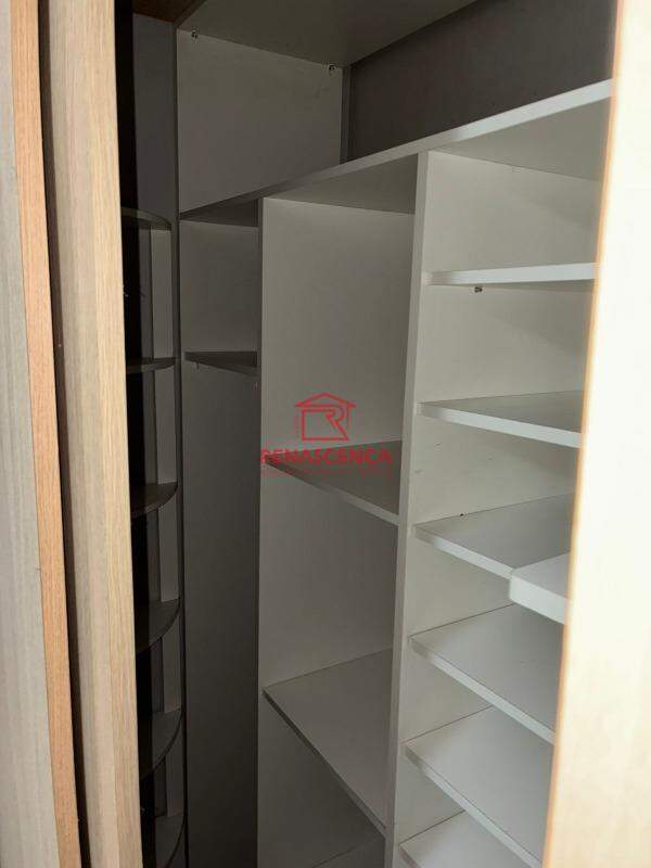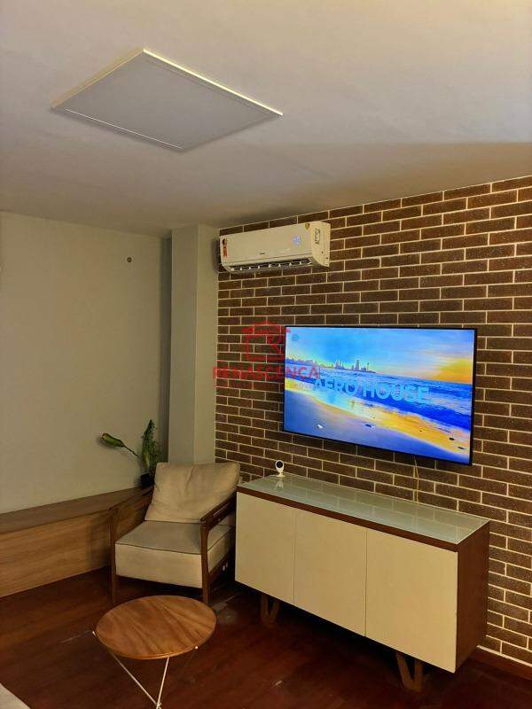 Suíte (fundos): armário de 5 portas, espaço otimizado com armário porta-mochilas, sapateira para até 20 pares, prateleiras para roupas de cama e toalhas, micro-armário para mala de mão, ar-condicionado split, cama queen e TV de 42 polegadas.