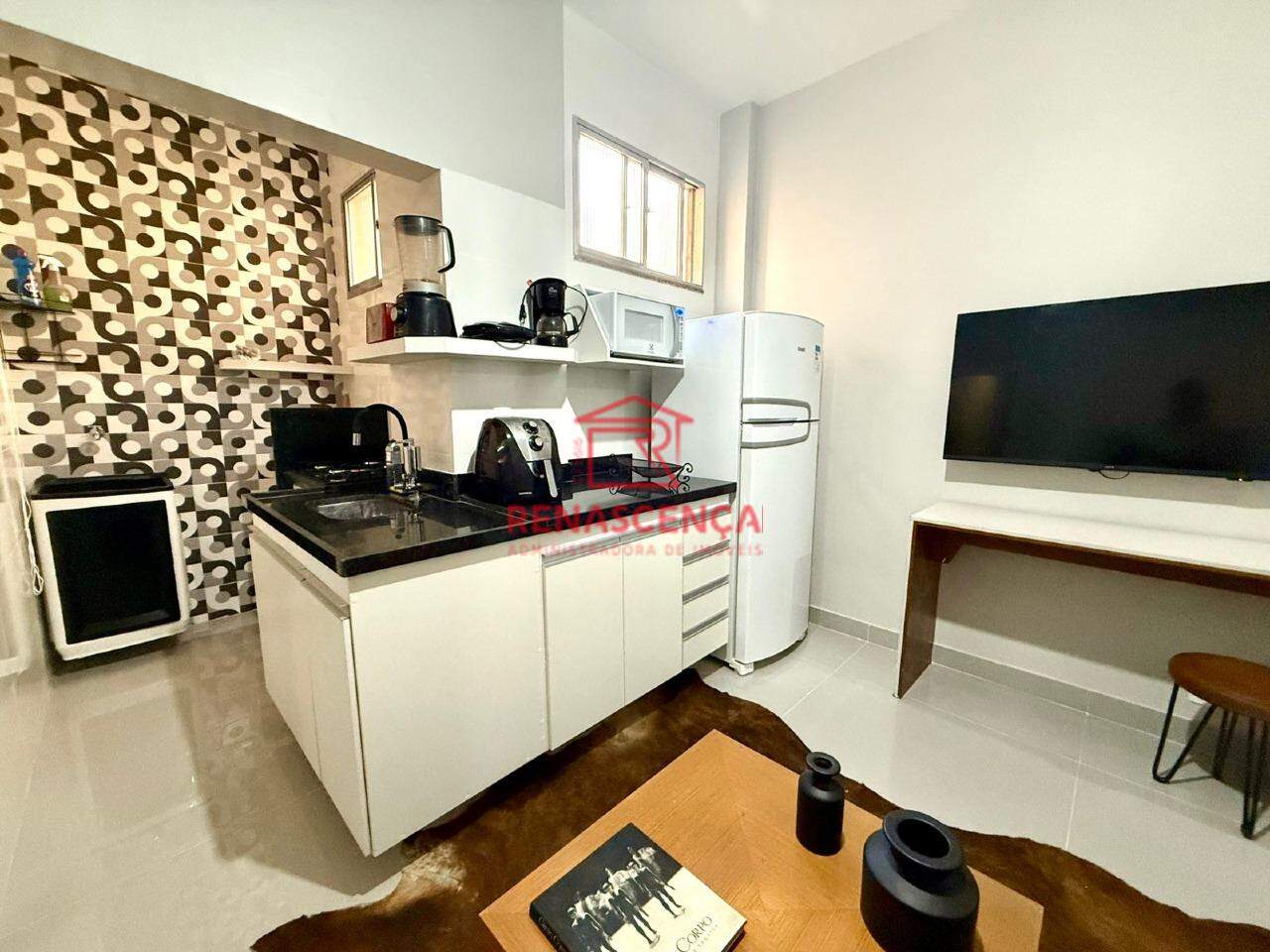 A sala é integrada à cozinha americana, criando um ambiente moderno e funcional. Com 1 quarto aconchegante, ideal para relaxar após o trabalho. Totalmente mobiliado e pronto para morar!
